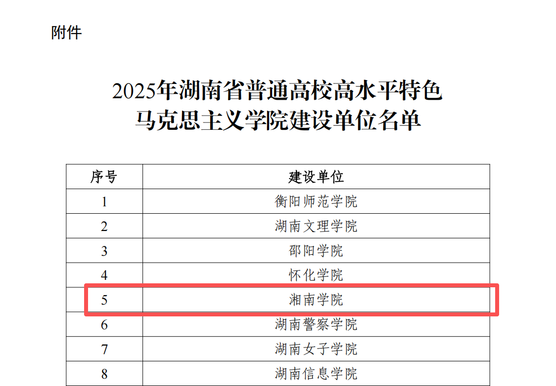 本网讯(通讯员 李冰婧)近日,中共湖南省委教育工委、湖南省教育厅正式公布2025年湖南省普通高校高水平特色马克思主义学院建设单位名单,我校马克思主义学院成功入选,标志我校马克思主义学院建设迈上新的发展平台。